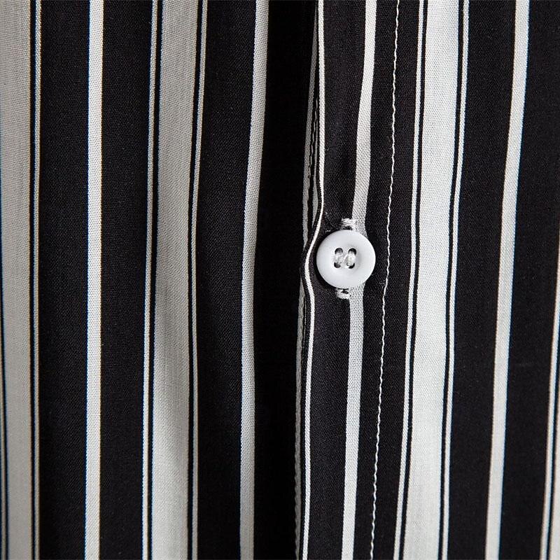 Featuring a classic turndown collar and a button-up front, this shirt combines timeless style with a new-age appeal. The bold vertical stripe pattern in black and navy blue adds a touch of sophistication, while the rolled short sleeves lend a casual flair, making it an excellent choice for any occasion.