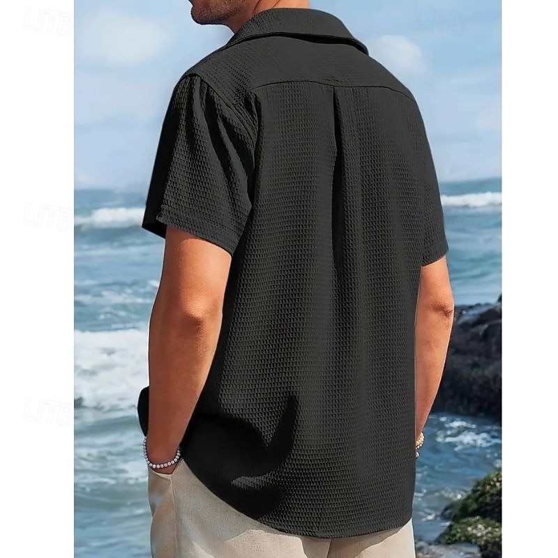 More information about Men's Waffle Shirt Summer Shirt Casual Shirt Waffle Knit Shirt Black White khaki Beige Light Blue Short Sleeve Textured Fashion Solid / Plain Color Turndown Vacation Holiday Pocket Clothing Apparel