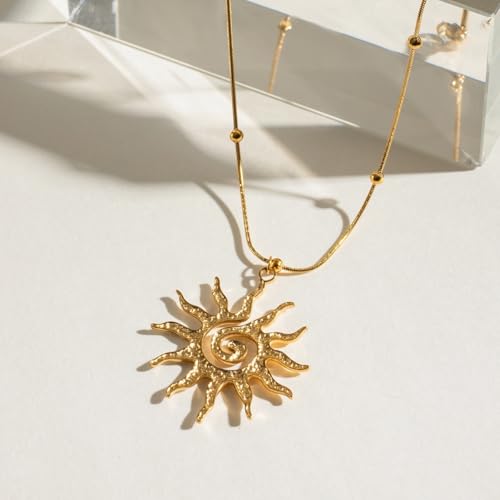 • trendy & Timeless Design: This elegant gold-plated sun pendant necklace features a stunning hammered sun design with a minimalist spiral motif. Its chunky, eye-catching look adds a touch of timeless beauty to any outfit, making it the faultless statement piece.