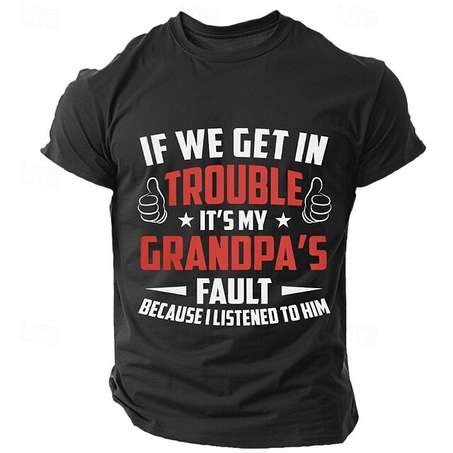 Highlights [Fabric] : Crafted from 100% cotton, this T-shirt offers a soft and breathable fabric that ensures comfort throughout the day. The micro-elastic nature of the fabric provides gentle stretch for ease of movement, making it ideal for everyday wear. [Fit] : The T-shirt features a regular fit, designed to offer a traditional and comfortable silhouette that is not too tight nor too loose. This fit complements various body types, adding to the versatility of the garment. [Design Highlights] : This short-sleeved T-shirt is adorned with a playful and humorous graphic print that reads, If We Get in Trouble It's My Grandpa's Fault Because I Listened to Him. The bold lettering in white and red against the black fabric adds a fun and quirky touch. The crew neck design further enhances its classic appeal. [Occasions] : Perfect for laid-back occasions, this T-shirt is ideal for sports, outdoor activities, and casual streetwear. Whether you're heading out for a relaxed day in the park or a casual weekend gathering, this tee makes an excellent choice for adults looking to express their fun and quirky side. [Size Range] : Available in a variety of sizes from S to XXL, this T-shirt ensures a suitable fit for a wide range of individuals. Choose from colors such as White, Black, Dark Blue, and Army Green to suit your personal style. I hope this description effectively captures the essence and appeal of the product for your target audience. Perfect for everyday use. top-grade materials and excellent craftsmanship ensure long-lasting durability.