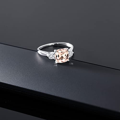 Gem Stone King 10K White Gold Peach Morganite and Moissanite 3 Stone Engagement Ring For Women (1.56 Cttw, Cushion 7MM, Gemstone October Birthstone) 1