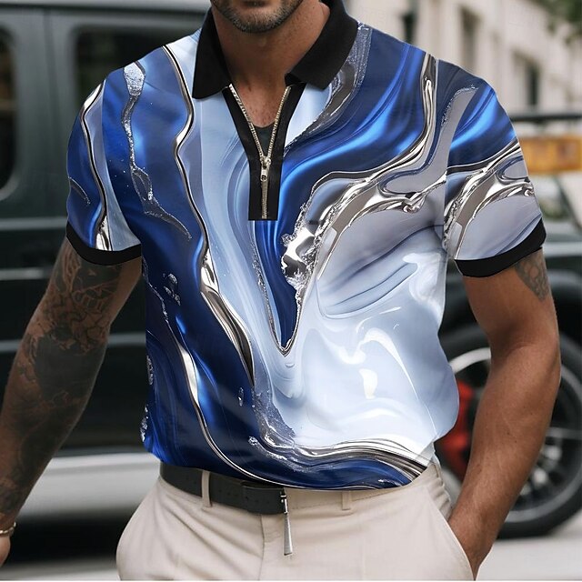 popular ! Men's Marble Zip Polo Shirts Short Sleeve Polo Shirts Collared Shirts Casual Athleisure Daily Wear 3D Print Summer Red Blue Green