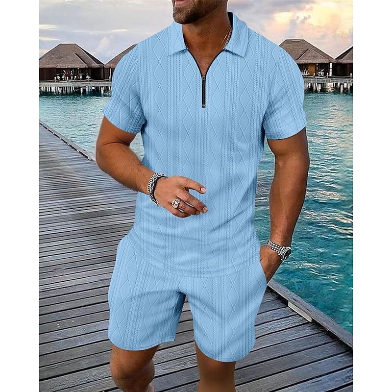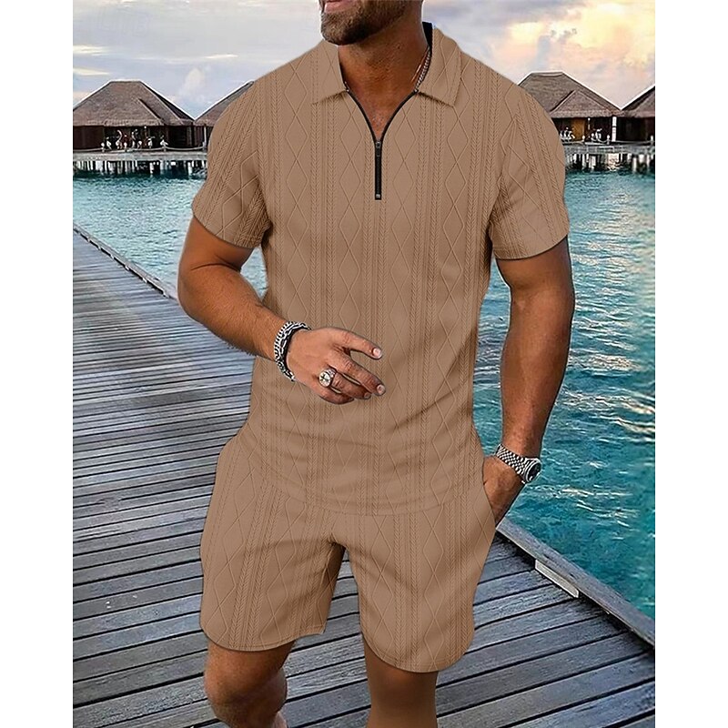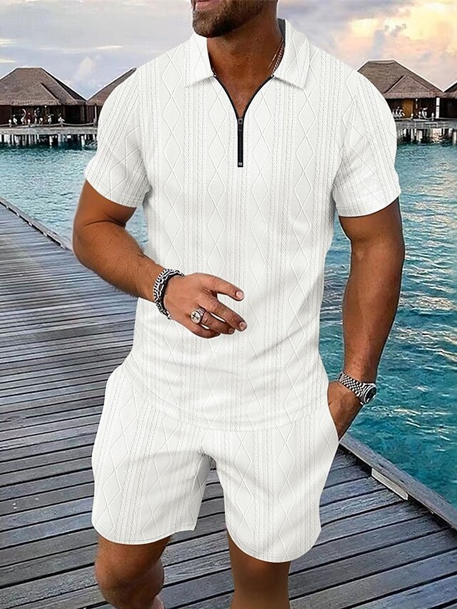 Men's Quarter Zip Polo Golf Shirt Daily Holiday Lapel Short Sleeve Fashion Basic Plain 2 Piece Jacquard Summer Regular Fit Black White Blue Khaki Army Green Gray Quarter Zip Polo 2