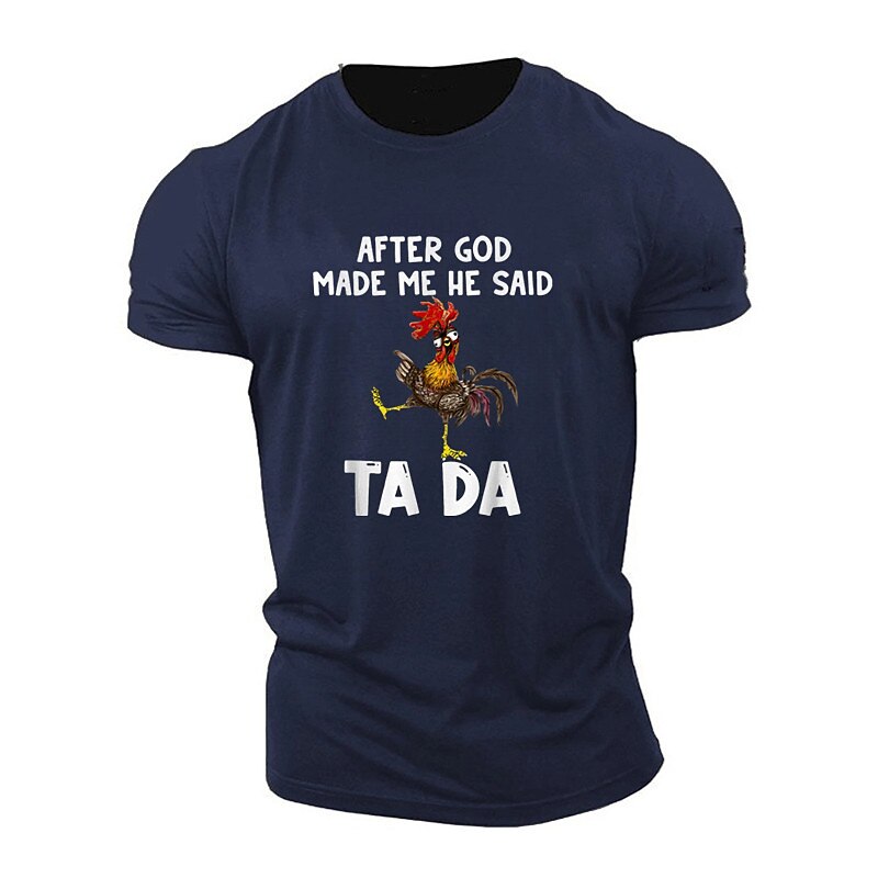 Highlights [Fabric:] Crafted from 100% cotton, this T-shirt ensures a soft and breathable experience for all-day comfort. The high-quality fabric offers micro-elasticity, providing ease of movement without compromising on durability. [Fit:] Featuring a regular fit, this T-shirt provides ample space for movement while maintaining a sleek silhouette. The classic crew neck and short sleeves enhance its versatile and timeless appeal, making it a great choice for any casual collection. [Design Highlights:] The shirt boasts a fun and quirky graphic design, showcasing a colorful rooster paired with the witty phrase, After God Made Me He Said TA DA. This playful print adds a touch of humor and personality, making the T-shirt a standout piece. [Occasions:] Perfect for sports, outdoor activities, holidays, or casual outings, this T-shirt is not only comfortable but also a great conversation starter. It effortlessly transitions from a relaxed day out to a memorable holiday event, suiting a variety of settings with its laid-back charm. [Size Range:] Available in a versatile range of sizes from S to XXL, this T-shirt accommodates various body types, ensuring a comfortable fit for adults. With color choices including White, Black, Red, Dark Blue, and Army Green, thereβs a perfect option for everyone. Perfect for everyday use. superior materials and excellent craftsmanship ensure long-lasting durability.