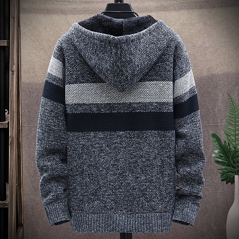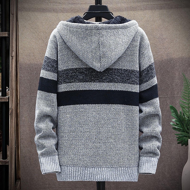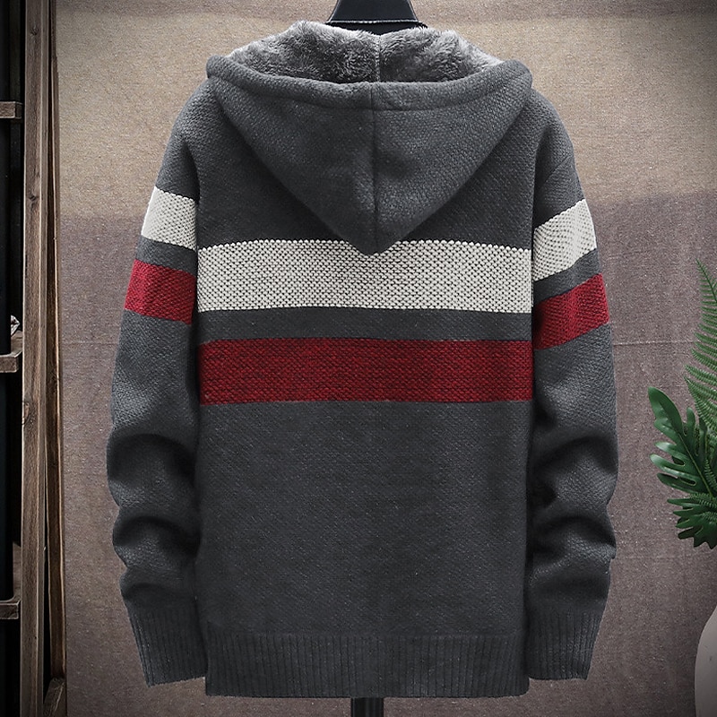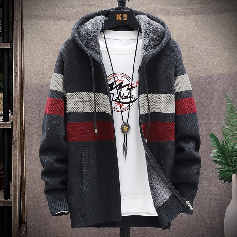Highlights [Fabric:] Crafted from a premium blend of acrylic, fleece, and knit materials, this men's sweater cardigan offers optimal warmth and a soft, comfortable feel, perfect for daily and outdoor wear in the fall and winter seasons. The micro-elastic fabric adds flexibility, ensuring comfort throughout the day. [Fit Type/Style:] Designed in a regular fit, this chic cardigan features a versatile zip-up style that combines elements of casual and cozy fashion. The ribbed cuffs and hem provide a snug fit, making it suitable for various body types. [Design Highlights:] Featuring a bold color block pattern, this sweater jacket includes rich shades with contrasting navy and wine stripes for a latest look. The hood is lined with plush material, adding extra warmth and comfort, while the full-length zipper and side pockets enhance its functionality. [Occasions:] Ideal for everyday outings, home lounging, and outdoor activities during cooler months, this cardigan is a fashionable and practical choice. Whether you're heading out for a casual day or engaging in outdoor adventures, this piece affords versatility in styling. [Size Range:] Available in sizes ranging from S to 2XL, this sweater caters to a wide range of fits, ensuring that every man finds his perfect size for the ultimate comfort and style.