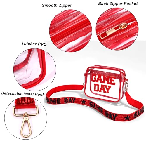 • Game day is our time to shine,show the world your love of the game in style with our game day accessories!This clear crossbody bag is the ideal Game Day bag!It has patch letters 'GAME DAY' sewn onto the front of the bag with a game day beaded sequins purse strap,has double hooks on either bag,perfect for taking to game day event,concerts,venues and more.Make a statement and carry everything you need in this game day clear stadium bag