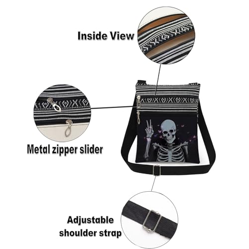 Gothic Skeleton Print Women Crossbody Bag - V Gesture Butterfly Design Men Adjustable Shoulder Strap Messenger Bag Birthday Gift Holiday Present​​ for Skull Lover Friend 1