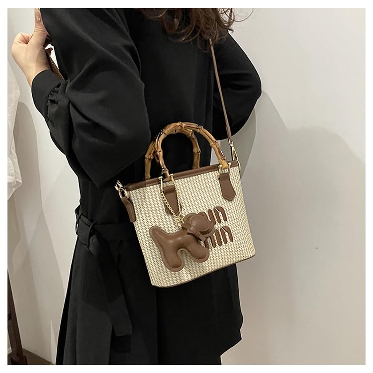 Woven Bucket Bag Crossbody HandBag Purse, Bamboo-Style Handle & Cute Dog Charm, Gift for Friend Her 1