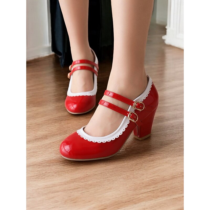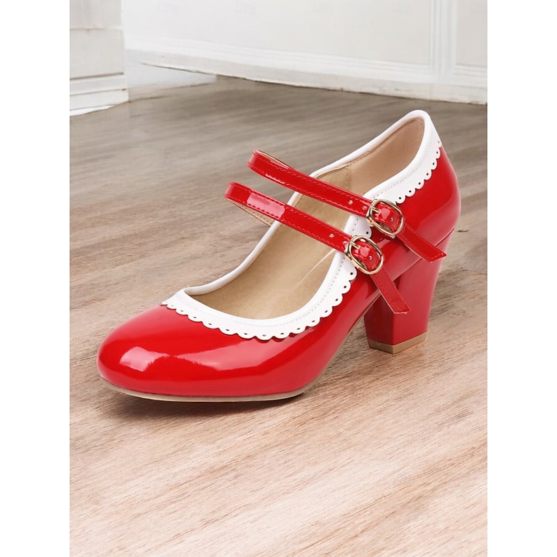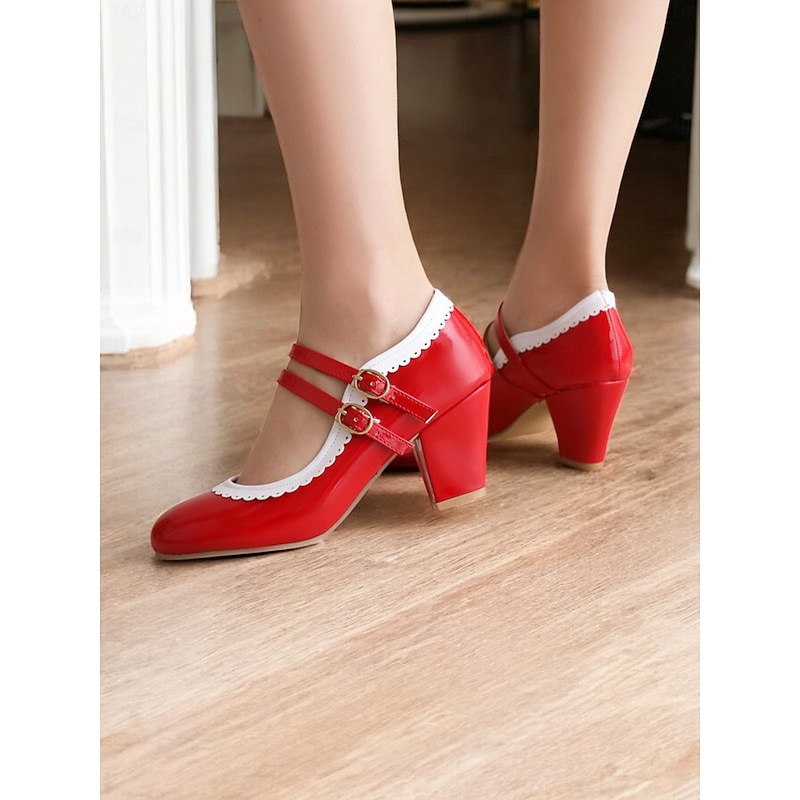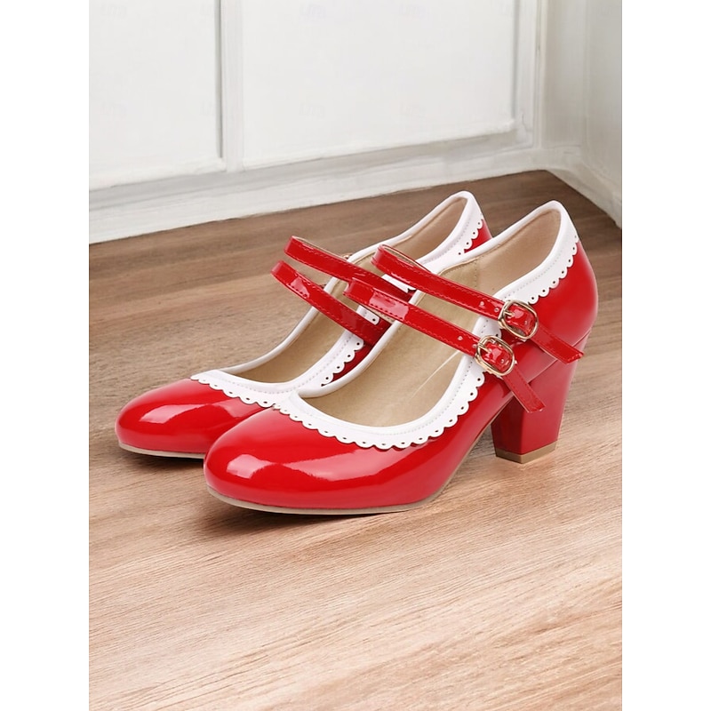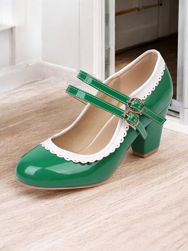 Highlights [Fabric & Material]: Crafted from high-quality PU leather with a synthetic leather lining, these Mary Jane heels exude a glossy and polished finish, ensuring durability and easy maintenance. The rubber outsole provides excellent grip and longevity. [Silhouette & Design]: Designed with a classic round toe and sturdy chunky heel, these shoes offer a harmonious blend of vintage elegance and present-day comfort. The vibrant green color with white decorative stitching enhances their playful, retro-inspired style, making them a standout addition to any wardrobe. [Design Highlights]: Featuring double adjustable buckle straps in gold, these heels ensure a snug and customizable fit. The scalloped edges add a playful touch, while the color-block pattern highlights the shoe's retro charm. [Occasions]: Ideal for various occasions, from daily wear to formal gatherings. Whether you're heading to work or attending a party, these heels add a pop of color and sophistication to your ensemble, perfect for spring, summer, fall, and winter. [Size Range & Suggestions]: Available in a comprehensive size range from US5.5 to US10.5, select your usual size for the best fit. These heels are designed to fit standard sizing for women, offering comfort and style for every occasion. Perfect for everyday use. superior materials and excellent craftsmanship ensure long-lasting durability.
