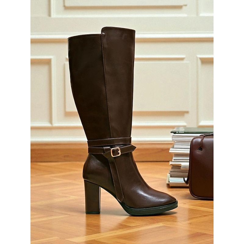 Women's Brown Knee-High Leather Fashion Boots – Elegant Block Heel Riding Style Long Boots with Buckle Strap for Autumn Winter Office and Casual Wear 1
