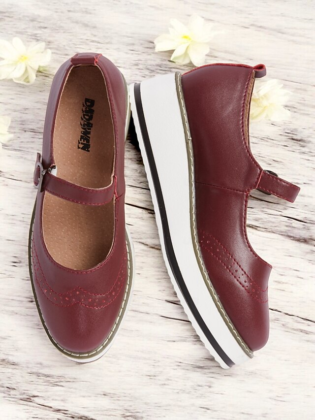 Highlights [sleek Platform Mary Janes:] [Fabric:] Made from high-quality faux leather, these Mary Jane shoes boast a smooth and polished finish. The durable material ensures longevity and style with every step. [Silhouette:] Featuring a comfortable platform design, these shoes provide added height without compromising on comfort. The classic round-toe shape offers ample room for your toes, ensuring an easy and relaxed fit for daily wear. [Design Highlights:] Adorned with elegant brogue detailing, these Mary Janes come with a secure buckle strap that is both adjustable and stylish. The embellishments add a vintage charm, complemented by the rich burgundy hue. The platform soles, crafted from sturdy rubber, offer excellent grip and stability. [Occasions:] Perfect for daily wear, whether you're heading to work or enjoying a casual outing. These shoes effortlessly blend fashion with practicality, making them suitable for a variety of occasions throughout all seasons. [Size Range:] Available in a range of sizes from US5.5 to US10.5, these shoes are designed to fit true to size, allowing you to confidently choose your usual shoe size for the perfect fit. Perfect for everyday use. superior materials and excellent craftsmanship ensure long-lasting durability.