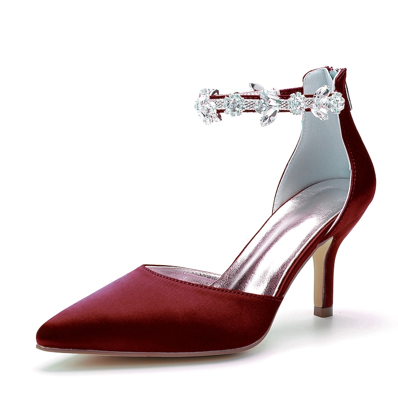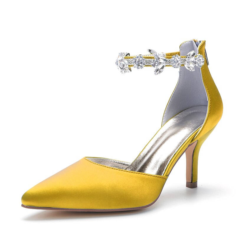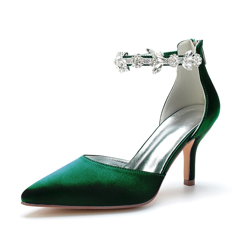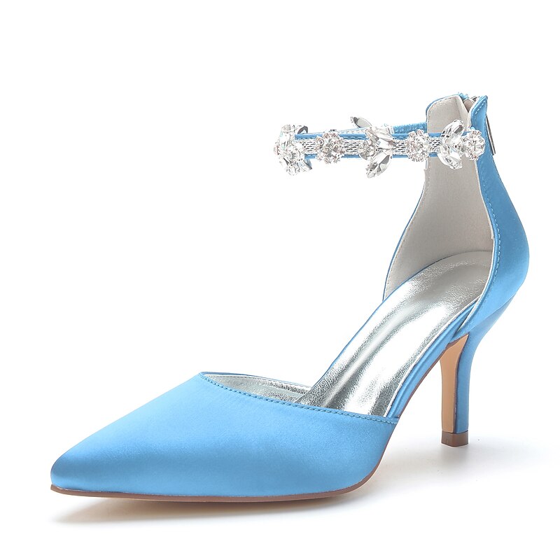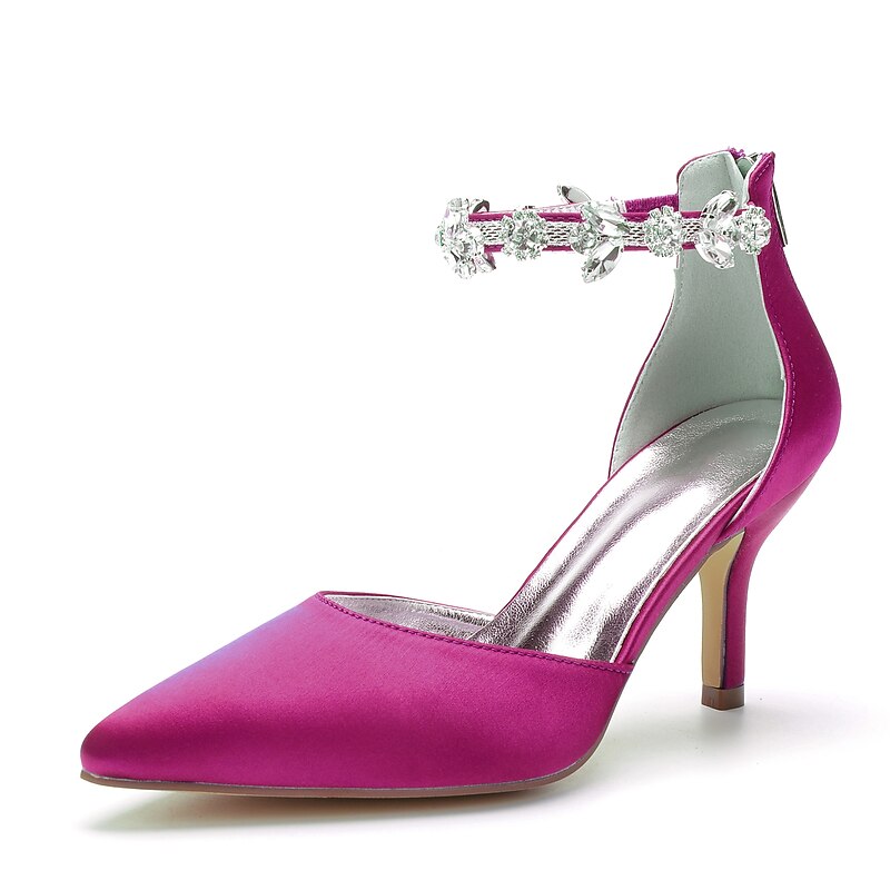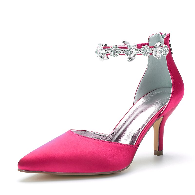 Highlights [Fabric] : Crafted from luxurious satin, these women's wedding shoes offer a soft, smooth texture that exudes elegance and sophistication. The satin material ensures a comfortable experience with a gentle touch against the skin. [Style] : Featuring a classic pointed toe and sleek stiletto heel, these heels embody a present-day minimalist aesthetic while providing an ideal balance of style and height. The design is timeless, making it suitable for various formal events. [Design Highlights] : The standout feature of these shoes is the embellished ankle strap, adorned with sparkling rhinestones and crystals. This not only adds a touch of glamour but also ensures a secure fit. The closed-toe silhouette offers additional elegance. [Occasions] : Perfect for weddings, formal events, parties, or any occasion demanding a touch of glamour. These heels are designed to enhance your ensemble with sophistication and style, making them an excellent choice for brides, bridesmaids, and guests alike. [Size Range] : Available in a wide range of sizes from 36 to 43, catering to various foot sizes and ensuring a comfortable fit for everyone. Perfect for everyday use. superior materials and excellent craftsmanship ensure long-lasting durability.