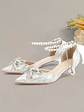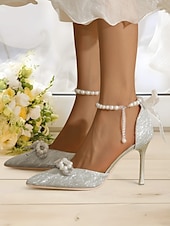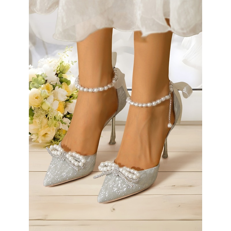 More information about Silver Glitter Pointed-Toe Kitten Heels with Pearl Anklet and Bow Accents for Women - Stunning Wedding Shoes