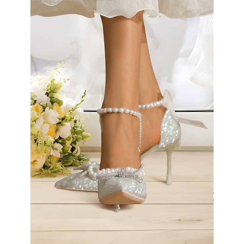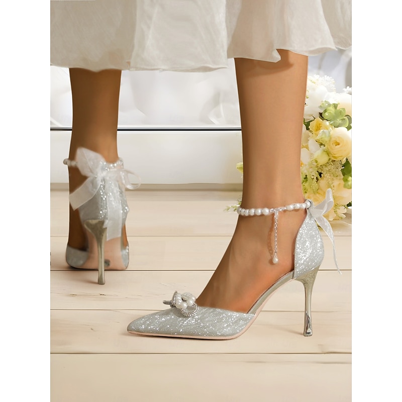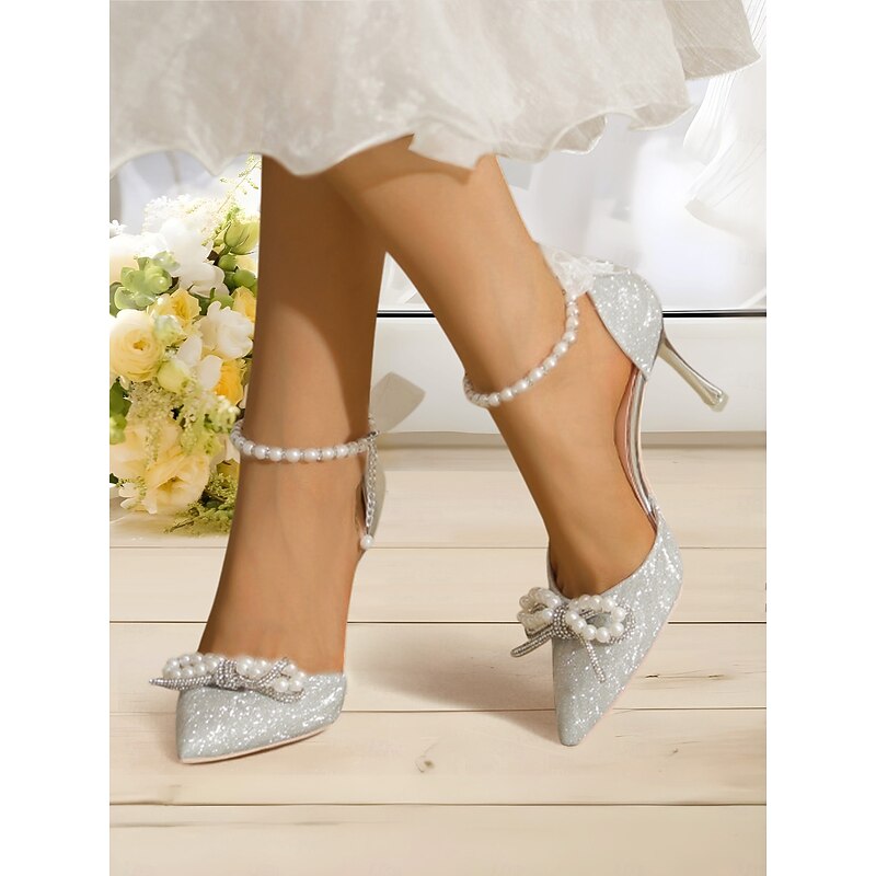 Silver Glitter Pointed-Toe Kitten Heels with Pearl Anklet and Bow Accents for Women - Stunning Wedding Shoes 12