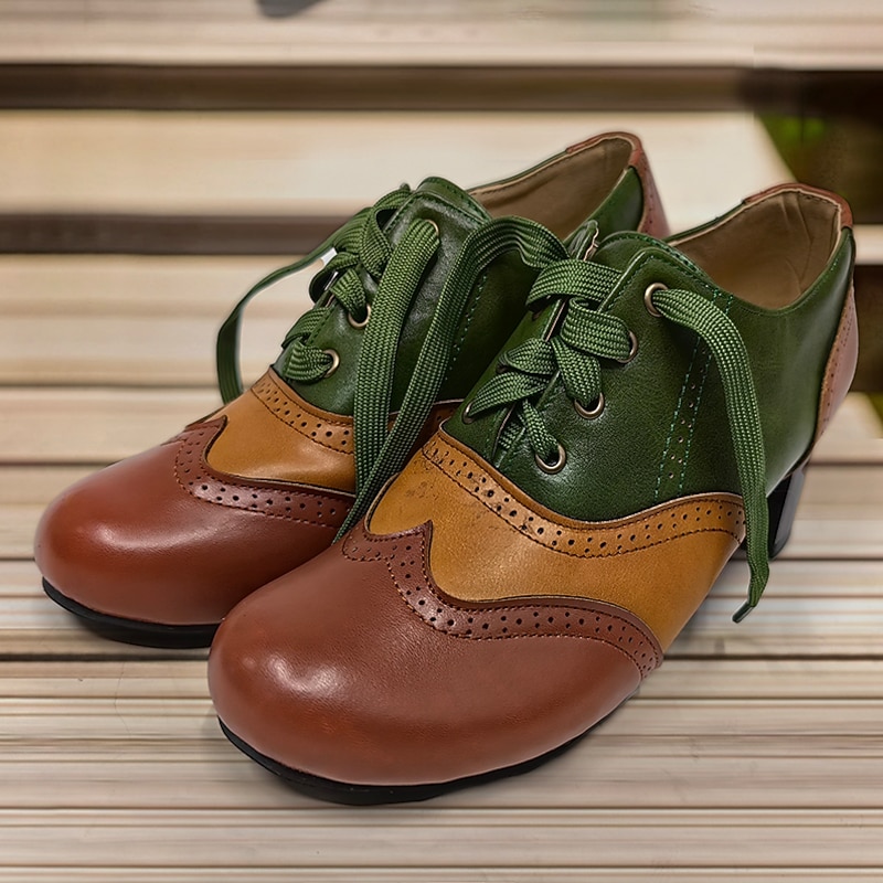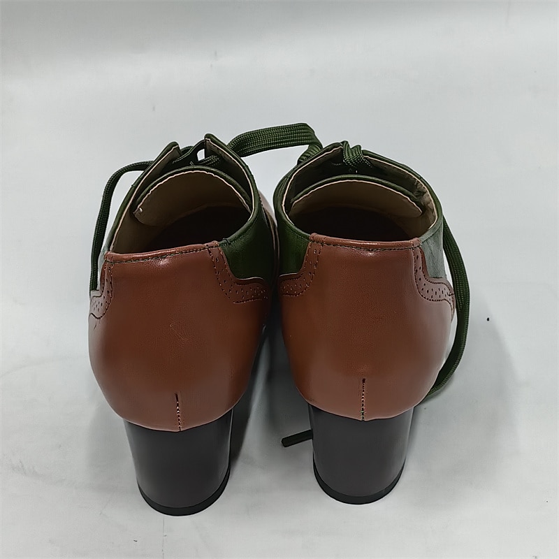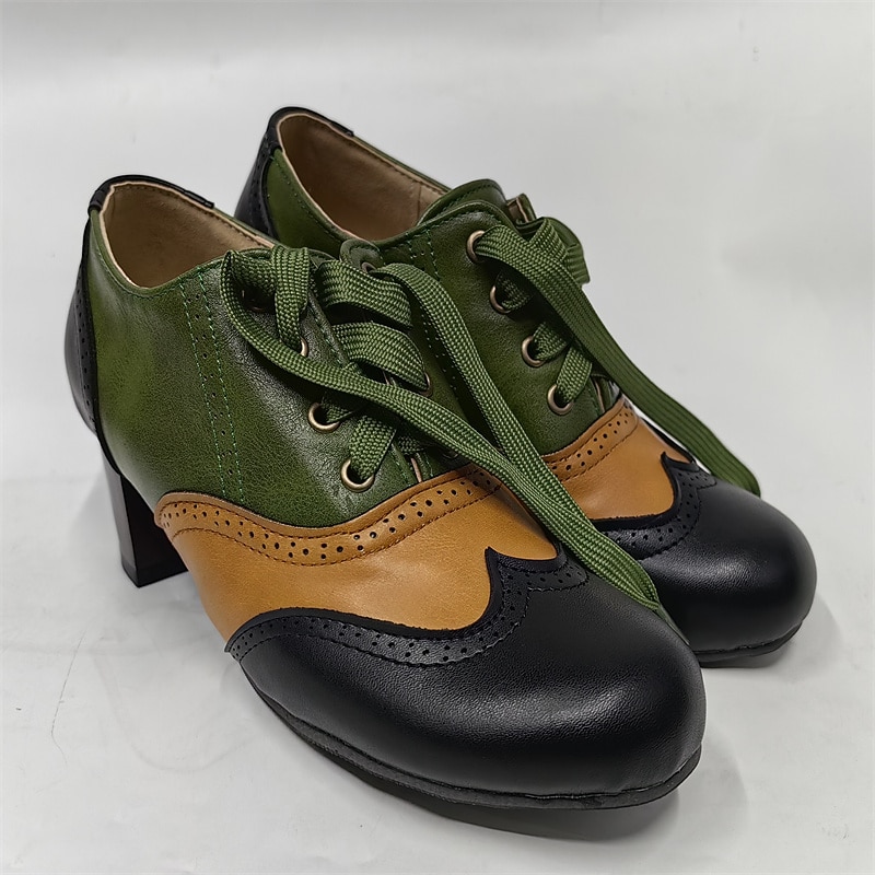 Highlights [Fabric]: Expertly crafted from high-quality leather, these women's shoes offer durability and a premium feel. The leather composition ensures a comfortable fit, suitable for extended wear across different occasions. [Style]: Featuring a sophisticated round-toe design and mid cone heel, these shoes combine vintage-inspired aesthetics with new-age comfort. The brogue wingtip detailing and lace-up front elevate the traditional oxford style. [Design Highlights]: These heels showcase an eye-catching color block pattern with multicolored leather panels in shades of black, purple, and yellow. The elegance is further accentuated by intricate brogue detailing, while the buckle closure adds a secure fit and an additional touch of sophistication. [Occasions]: Perfect for a wide variety of settings, from party to daily wear or outdoor strolls. Whether you're heading to a vacation, attending a semi-formal event, or enjoying a casual day out, these shoes add a special flair and elegance to any outfit. [Size Notice]: Available in a range of sizes from US6 to US10.5 (EU36 to EU42), these shoes are designed to fit standard sizes. It is recommended to select your usual size for the best fit.