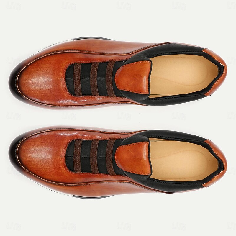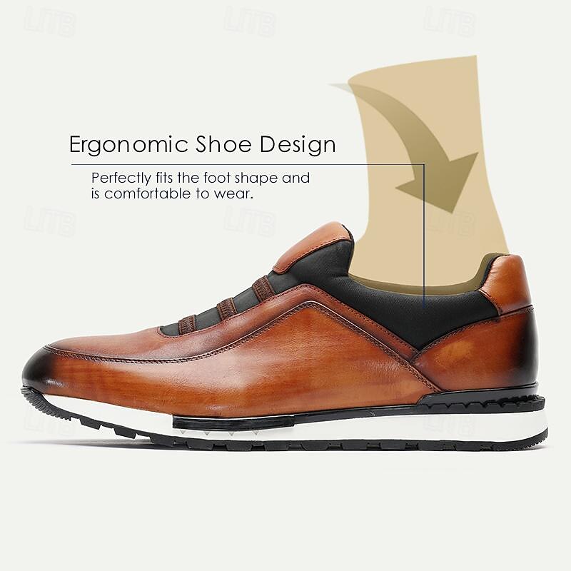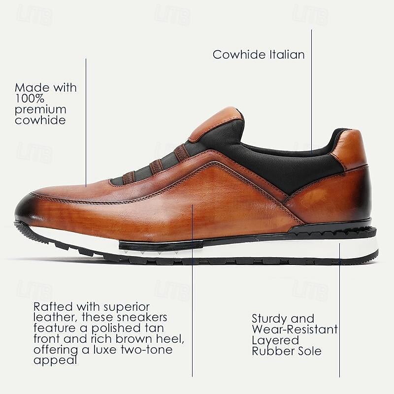 Highlights [Fabric] Crafted from luxurious Italian full-grain cowhide leather, these men’s dress sneakers offer unmatched quality and a sophisticated look. The leather lining ensures comfort and breathability, making them ideal for extended wear. [Fit] Designed with a round toe and lace-up closure, these sneakers provide a snug and tailored fit, balancing style and comfort. The slip-resistant sole ensures confidence with every step. [Design Highlights] The sleek brown finish with contrasting black accents adds new-age flair, while the elastic bands on the slip-on design ensure ease of wear. The durable EVA outsole delivers excellent traction and support. [Occasions] Perfect for a range of settings, from formal events to casual outings, these versatile sneakers make a fashionable addition to any wardrobe. Whether dressing up for a meeting or enjoying a weekend gathering, they cater to both formal and casual occasions with ease. [Size Range] Available in a wide size selection from US6 to US13, these sneakers accommodate various foot sizes, ensuring a comfortable and perfect fit for everyone.