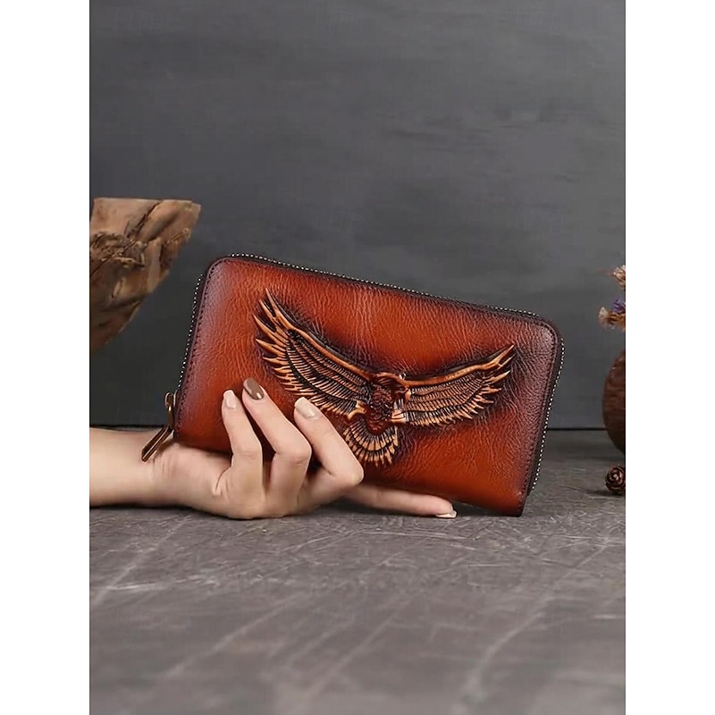 Women's Genuine Leather Long Wallet with Carved Eagle Design, Vintage Zipper Clutch Purse for Stylish Ladies, Perfect for Daily Use and Special Occasions 1