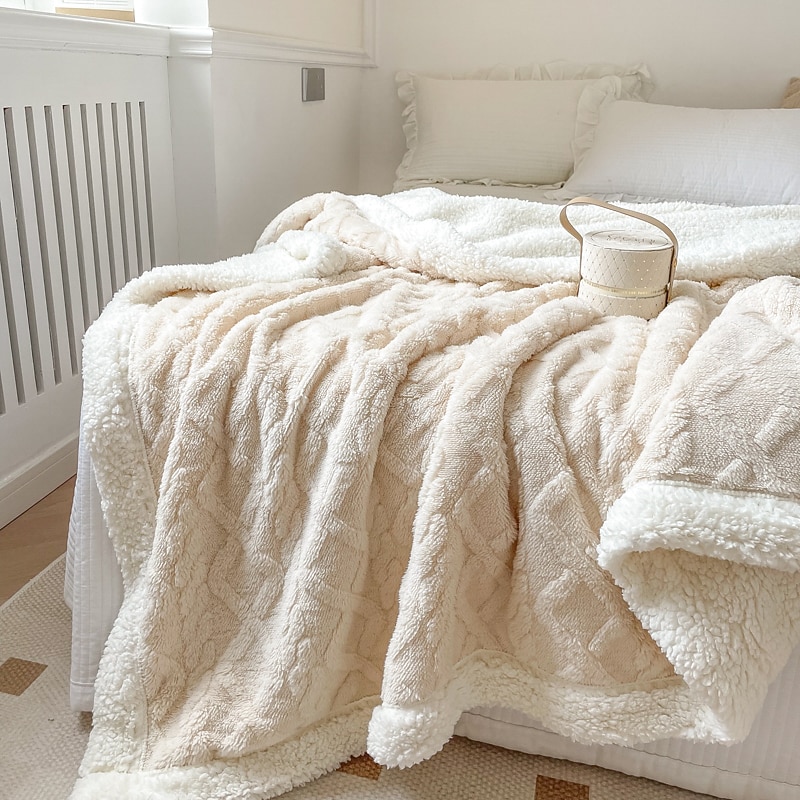 : Crafted from high-quality flannel toison and polyester, this blanket boasts a super plush and warm texture. The intricate jacquard weave adds a touch of elegance, while the plush fabric ensures durability and comfort. Its luxurious inner lining is designed with fluffy sherpa material for extra warmth, perfect for colder seasons.