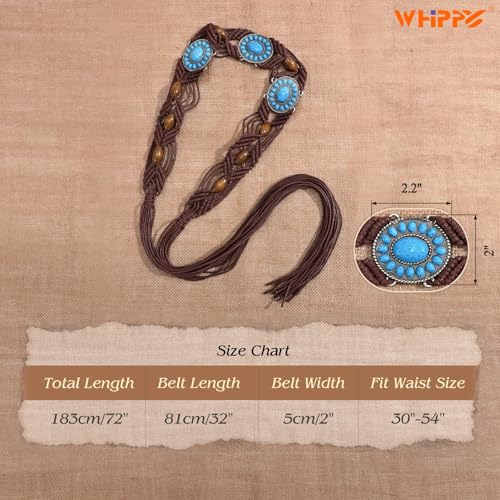 popular ! WHIPPY Boho Turquoise Belt for Women Wax Rope Braided Waist Belt Western Hand-Woven Bead Tassel Belts for Dress, 2" Wide