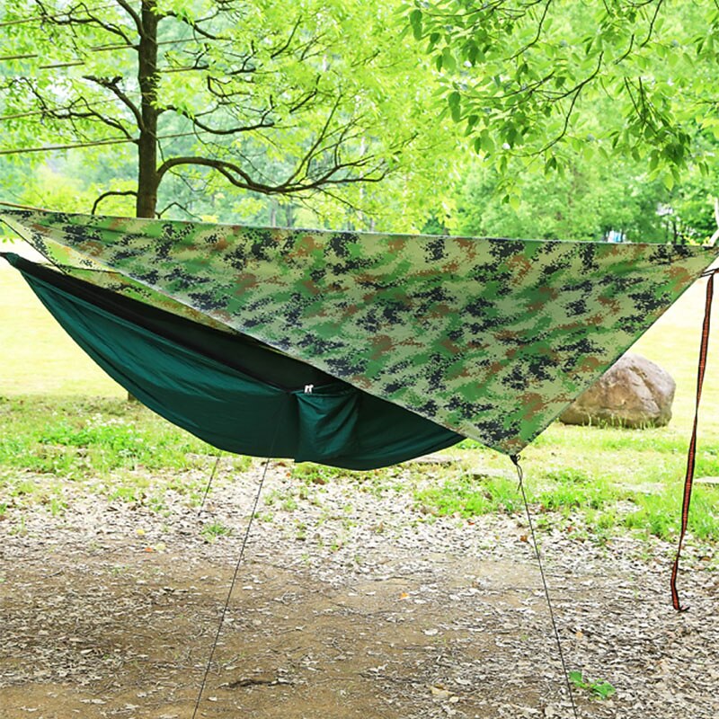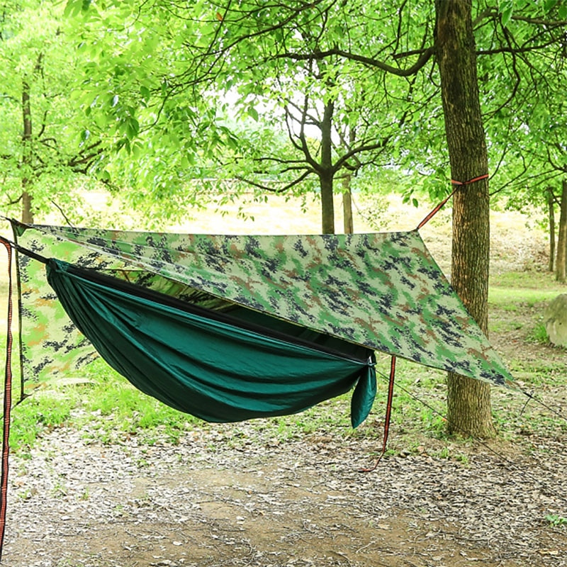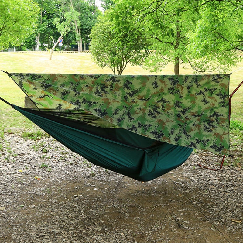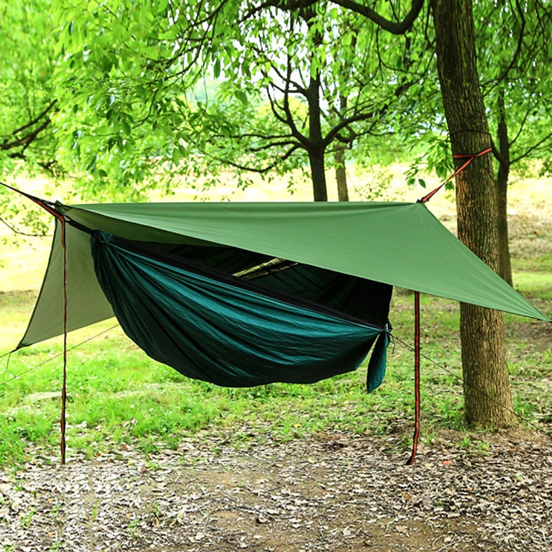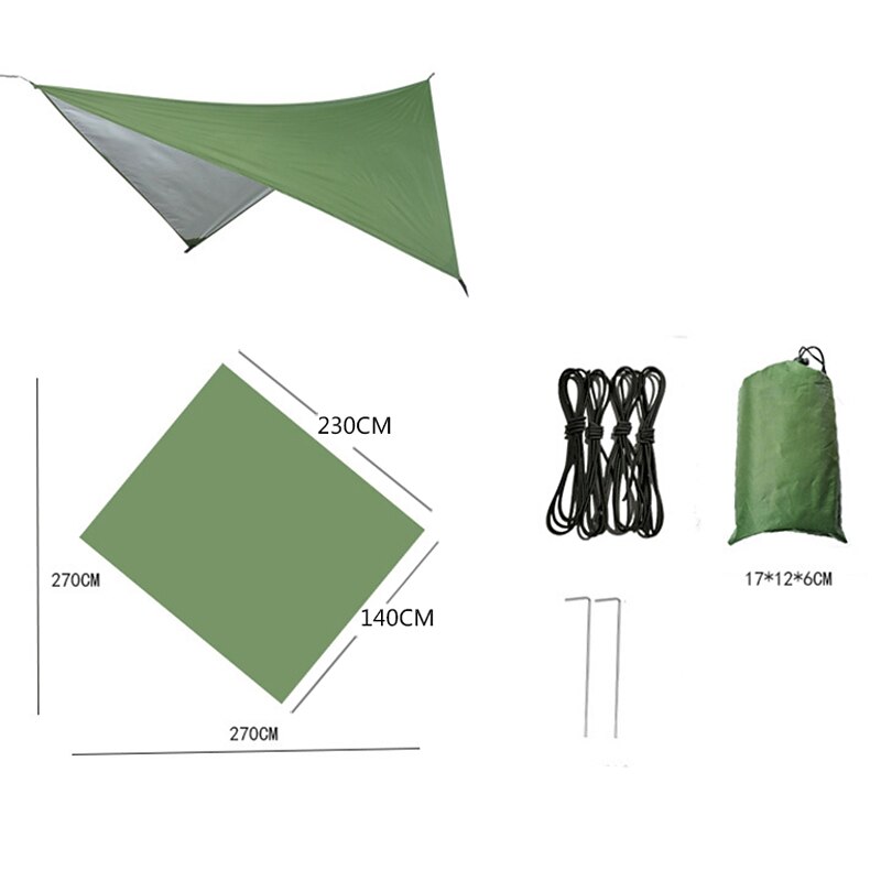 Highlights - High-quality Camping Hammock Package includes a hammock with mosquito net to provide a peaceful and bug-free sleeping environment during your camping adventures. - Comes with 2m tree straps and 2 anti-rust steel carabiners for easy and secure hanging between trees. - Includes a mosquito net rope and 2 wind ropes for added stability and protection against insects and wind. - Convenient storage bag ensures easy portability and storage of the hammock and its accessories. - Rain Fly Package features a reliable rainfly tarp to keep you dry during unexpected rainfall. - Equipped with 4 aluminum pile stakes for sturdy setup and protection against sturdy winds. - Comes with 2 anti-rust steel carabiners for quick and secure attachment. - Includes a storage bag for easy transportation and storage of the rainfly and its components. - 4 wind ropes included for additional stability and peace of mind during outdoor activities. - Made with premium quality parachute nylon material for enhanced durability and comfort. - Ultra Lightweight (UL) design makes it easy to carry and pack, flawless for backpacking and hiking. - Built-in anti-mosquito function ensures a restful and bug-free sleeping experience during your outdoor trips.