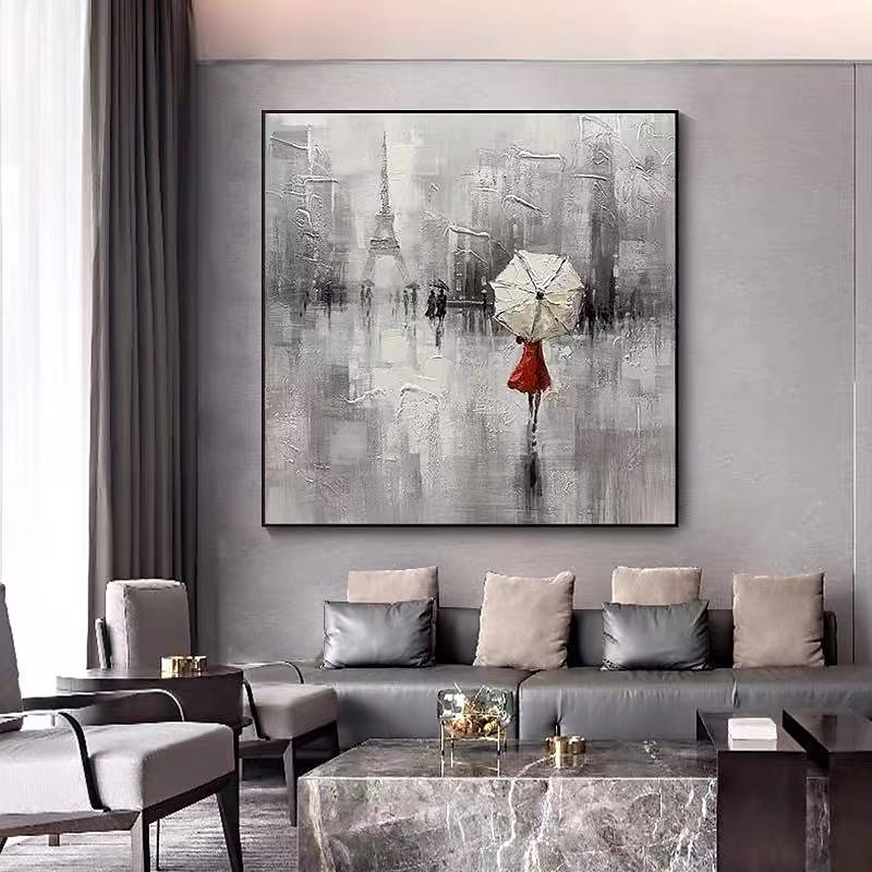 Large Size Oil Painting 100% Handmade Hand Painted Wall Art On Canvas Eiffel Tower Women Hold An Umbrella contemporary Contemporary Home Decoration Decor Rolled Canvas No Frame Unstretched