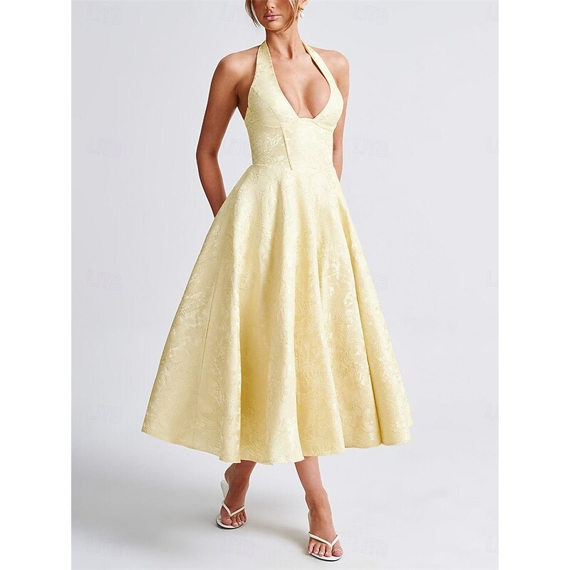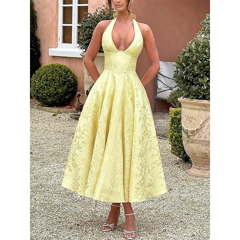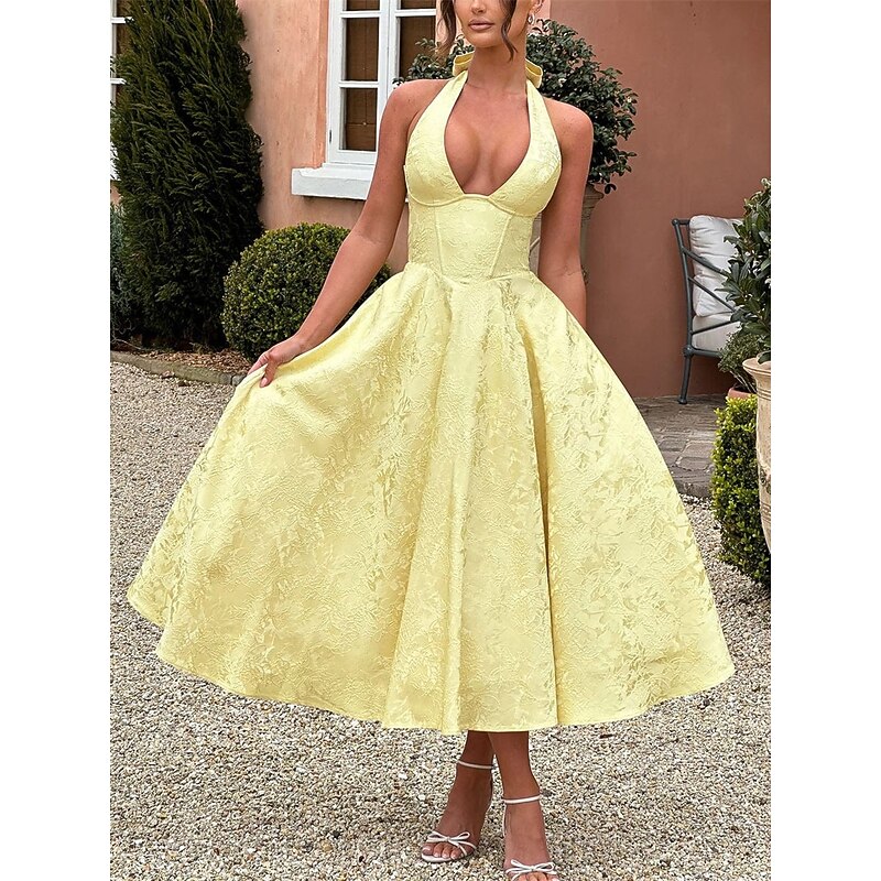 popular ! A-LineDress Jacquard Dress Semi Formal Cocktail Dress Wedding Midi Length Sleeveless Halter Neck Bow Backless with Lace Up Detail Wedding Guest Dress