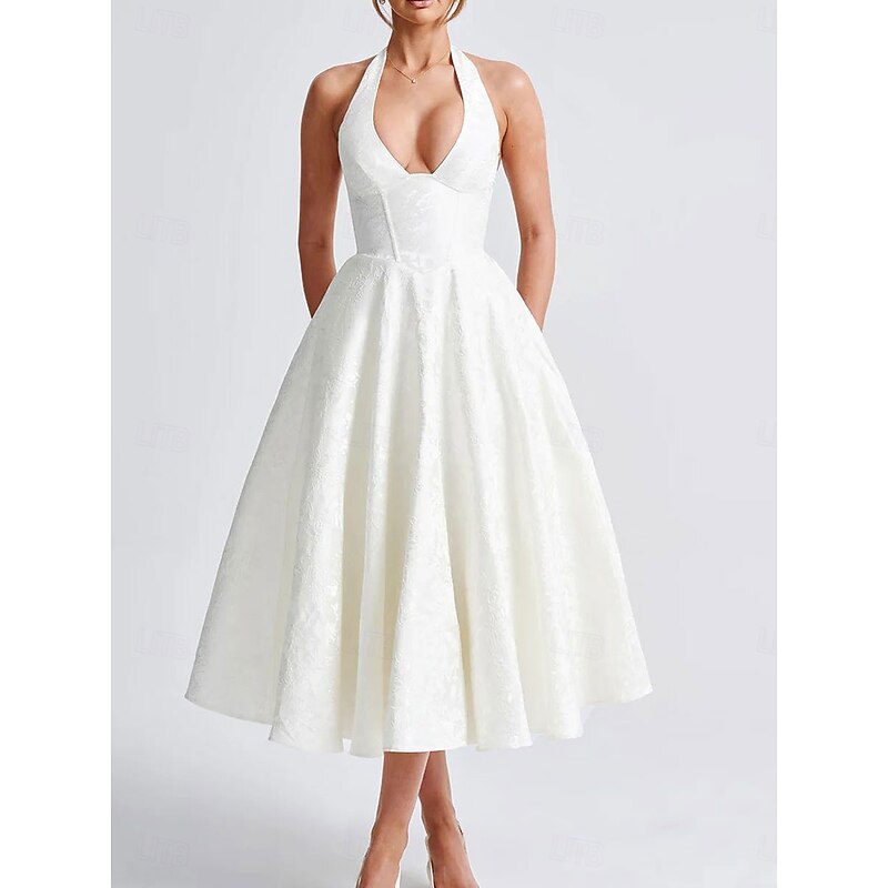 A-LineDress Jacquard Dress Semi Formal Cocktail Dress Wedding Midi Length Sleeveless Halter Neck Bow Backless with Lace Up Detail Wedding Guest Dress 14