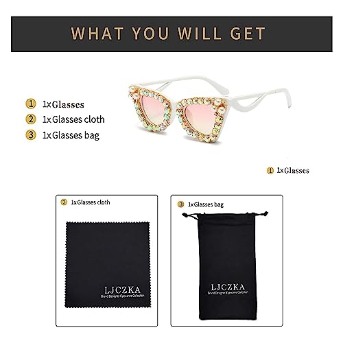 More information about LJCZKA Sparkling Crystal Cat Eye Sunglasses Women Square Rhinestone Pearl Sun Glasses Party Diamond Bling Punk Eyewear