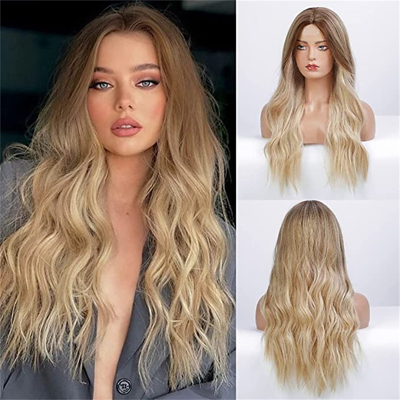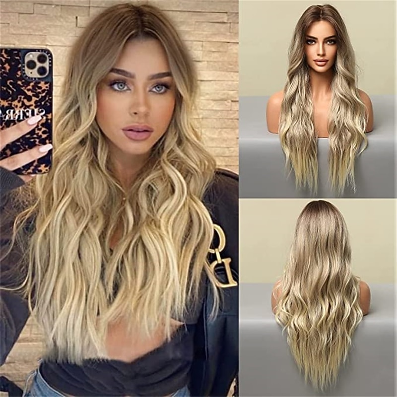 Barbiecore Movie Wigs Long Blonde Wigs with Bangs for WomenSynthetic Wavy Hair Wig with Dark Roots 24