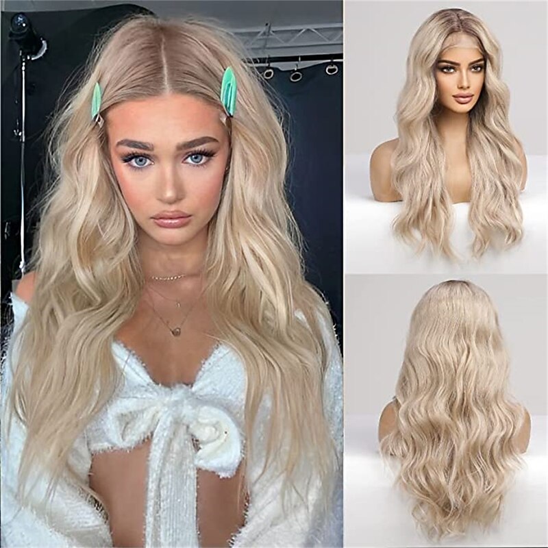 Barbiecore Movie Wigs Long Blonde Wigs with Bangs for WomenSynthetic Wavy Hair Wig with Dark Roots 33
