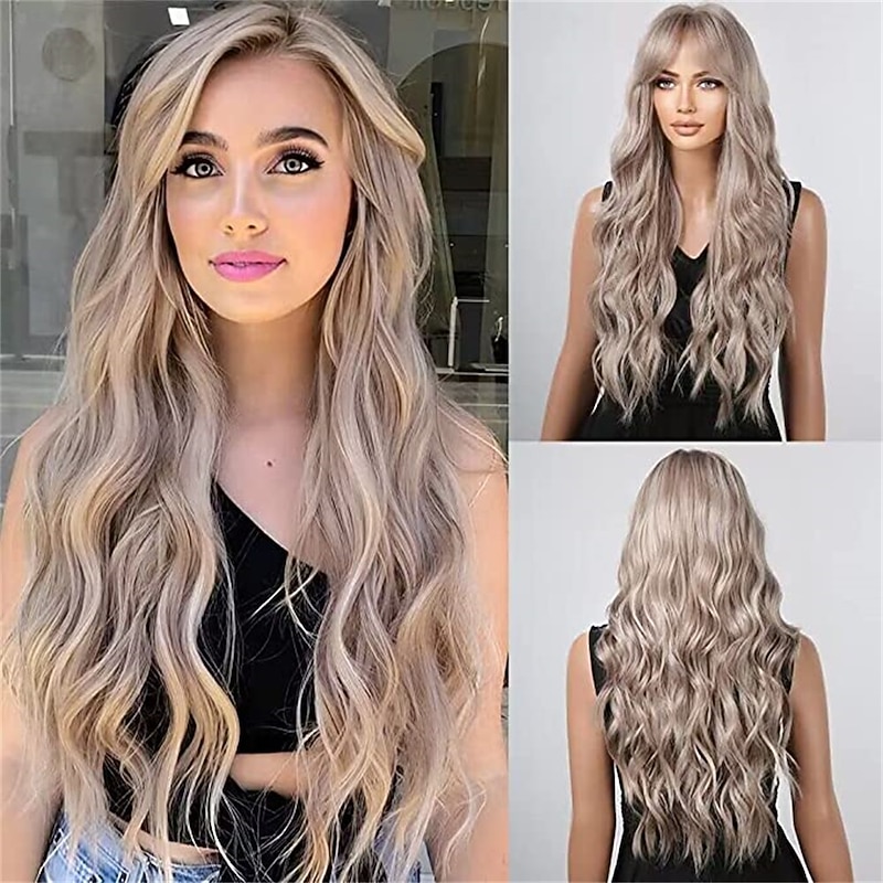 Barbiecore Movie Wigs Long Blonde Wigs with Bangs for WomenSynthetic Wavy Hair Wig with Dark Roots 26