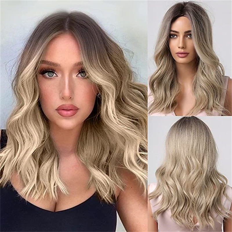 Barbiecore Movie Wigs Long Blonde Wigs with Bangs for WomenSynthetic Wavy Hair Wig with Dark Roots 22