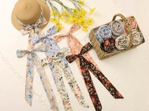 Women Floral Chiffon Scarves, Square Neck Scarf Neckerchief, Skinny Long Ribbon Hair Band 5