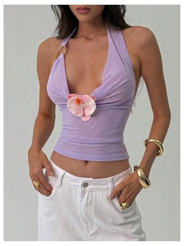 Why Choose MakeMeChic Women's 3D Floral Crop Tops Mesh Draped Ring Linked Sleeveless Going Out Halter Top?