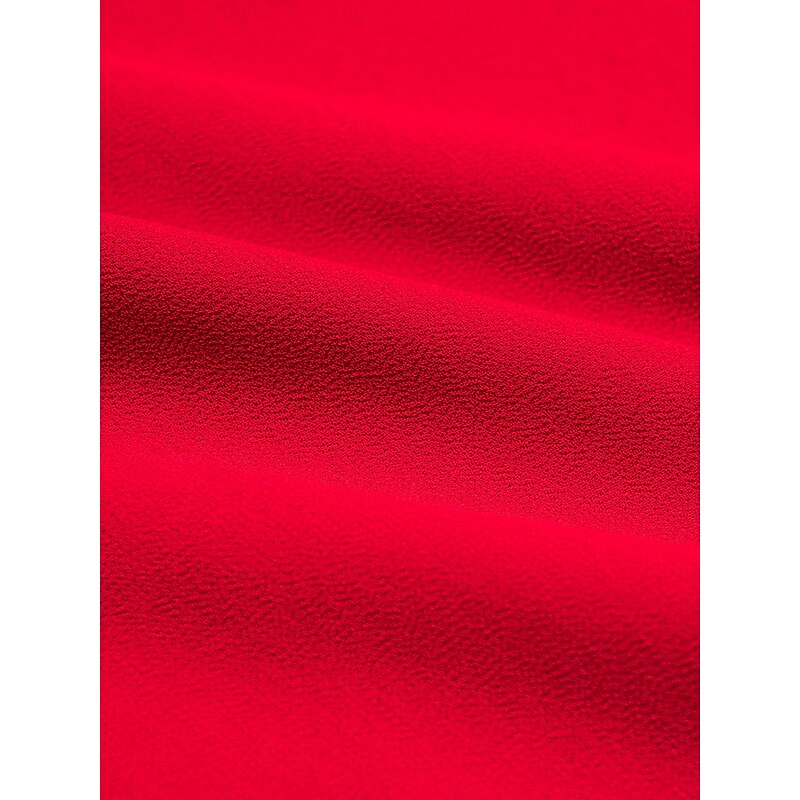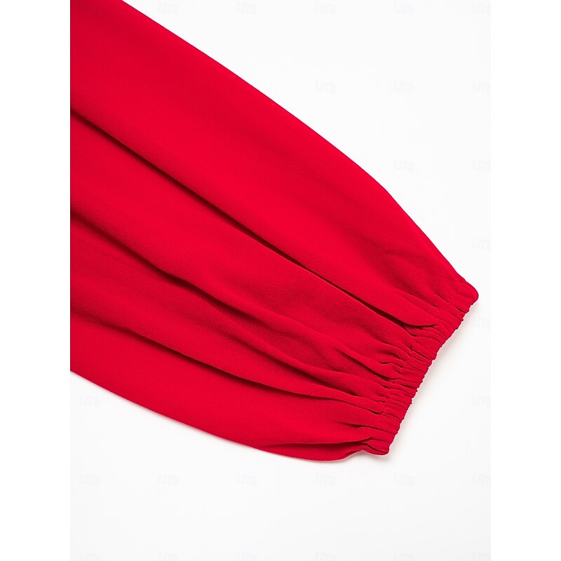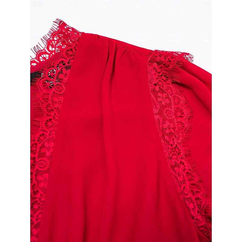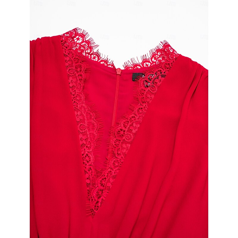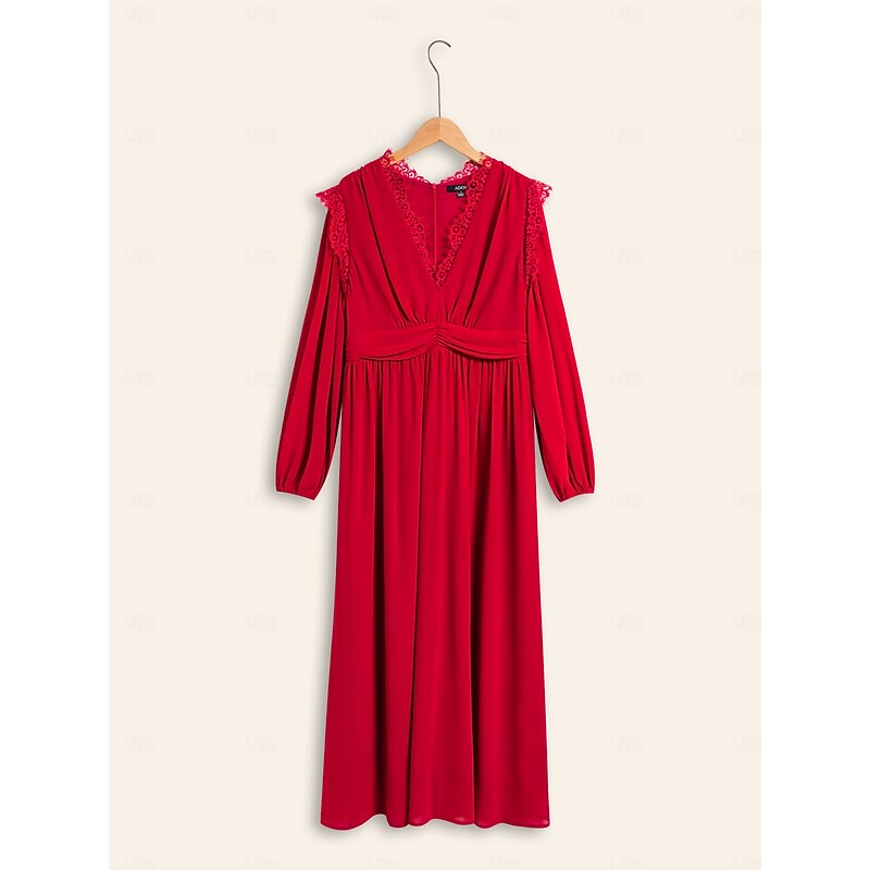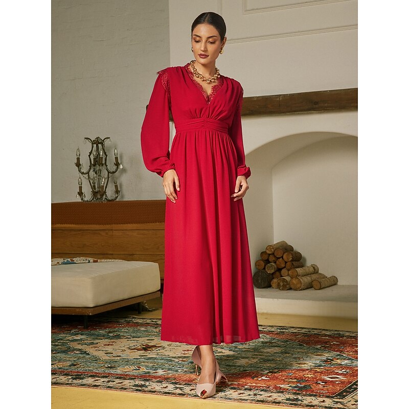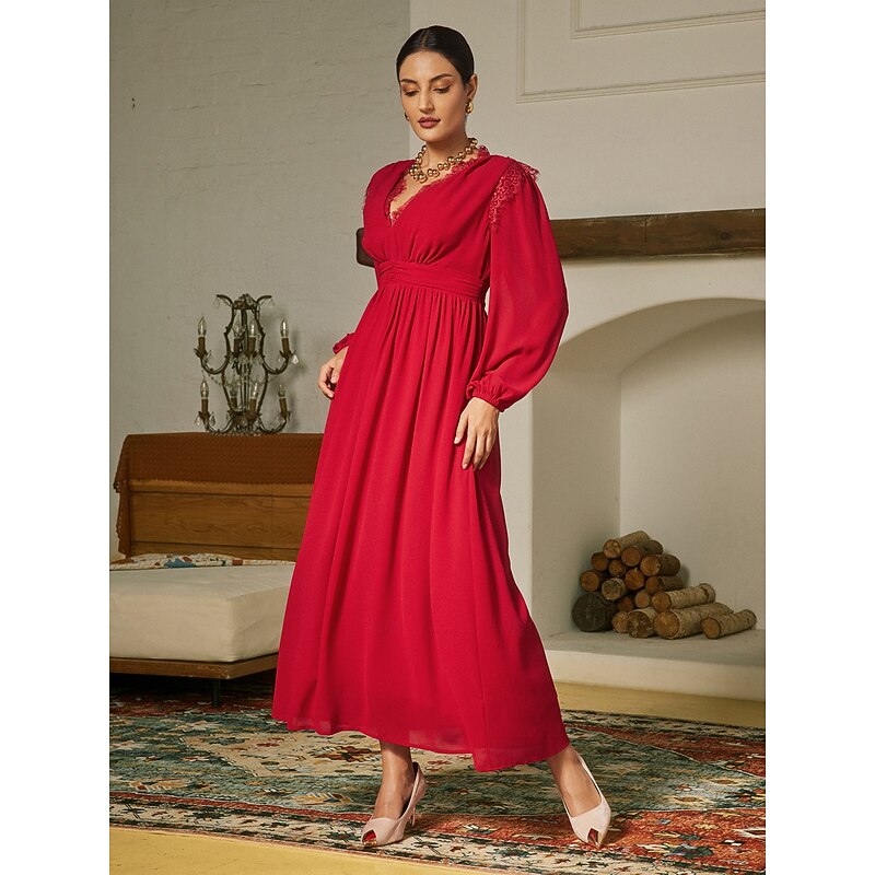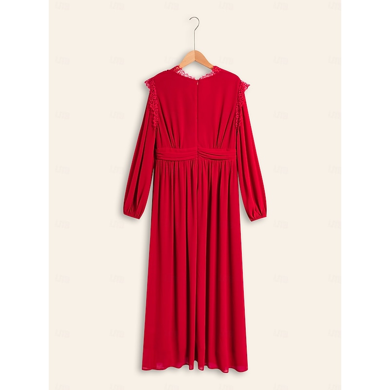 Highlights [Fabric] : Made with WhisperFlow Chiffon and lace over satin, this dress provides a weightless and flowy texture that adds an airy elegance to your look. The choice of luxurious materials ensures softness and comfort, perfect for day-long wear. [Silhouette] : Featuring a flattering A-line silhouette, this dress accentuates the waist and elegantly drapes down to a maxi length, providing a sophisticated and graceful appearance for any formal occasion. [Design Highlights] : The dress showcases a striking V-neckline and long, lantern sleeves with gathered cuffs, bringing a timeless appeal. Delicate lace detailing on the shoulders adds a romantic touch, while the solid red color contributes to its glamorous and captivating look. [Occasions] : Ideal for weddings, galas, evening events, and holiday parties, this dress offers a blend of classic charm and new-age elegance. Whether it's a New Year celebration or an anniversary, it ensures you make a fashionable statement. [Size Options] : Available in a range of sizes from XS to XXL, providing a regular fit that caters to various body types, ensuring the perfect fit for different individuals.