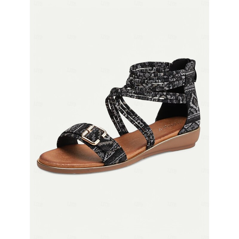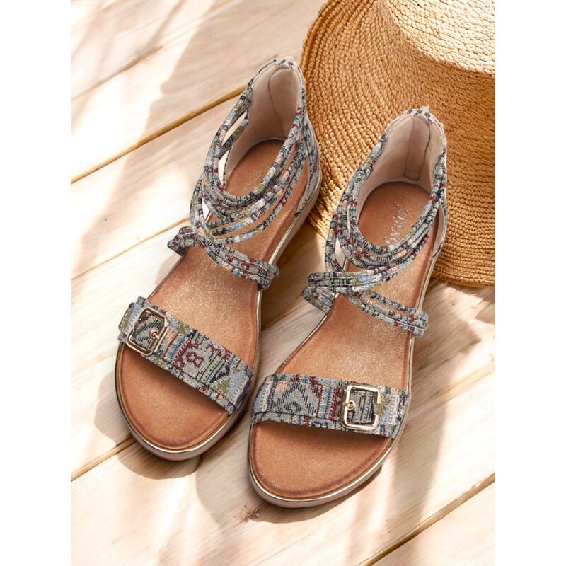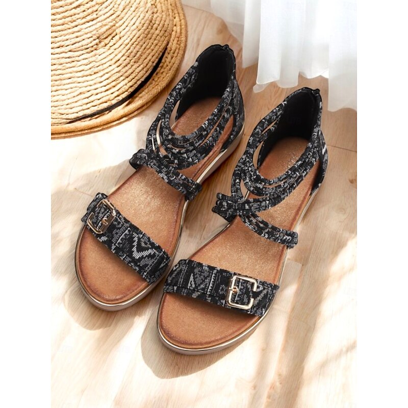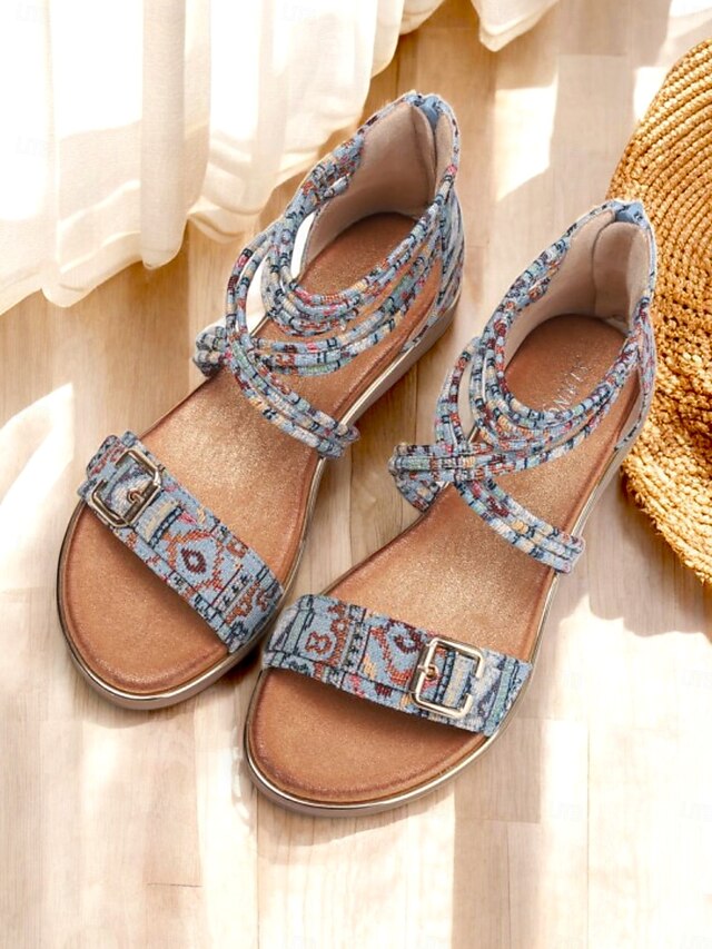popular ! Women's Bohemian Strappy Flat Sandals – Ethnic Print Ankle Wrap Gladiator Sandals with Buckle for Summer, Beach & Casual Outfits