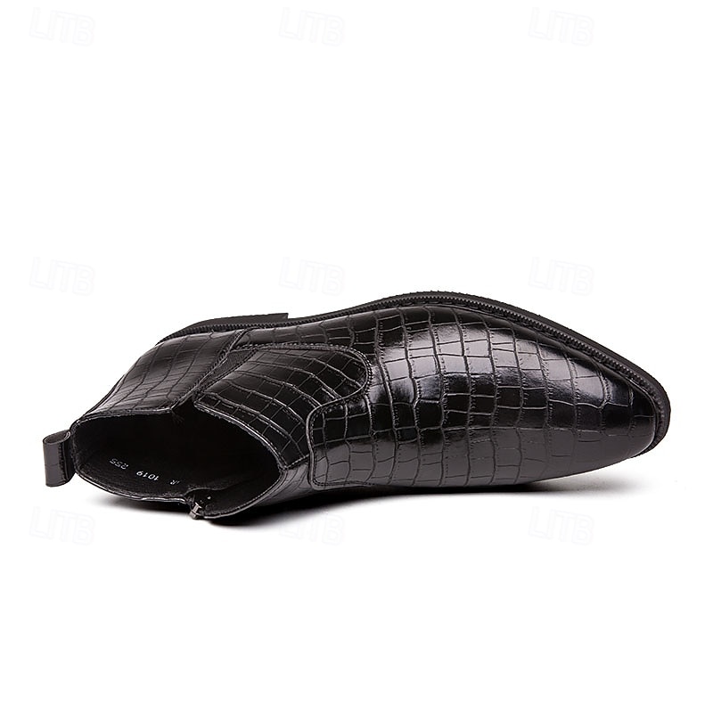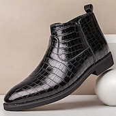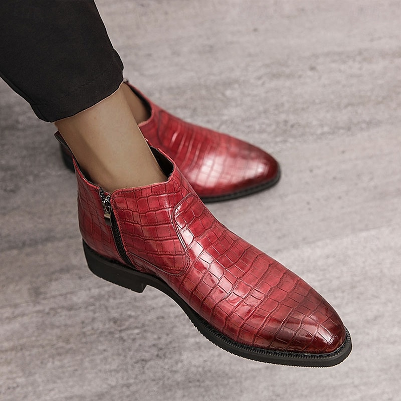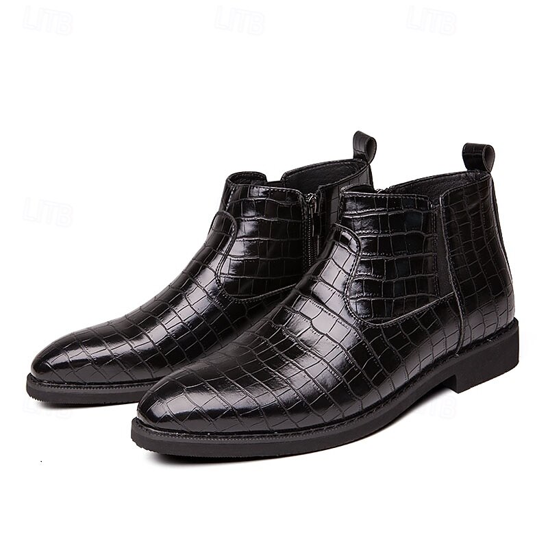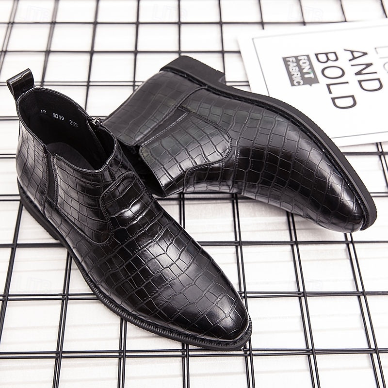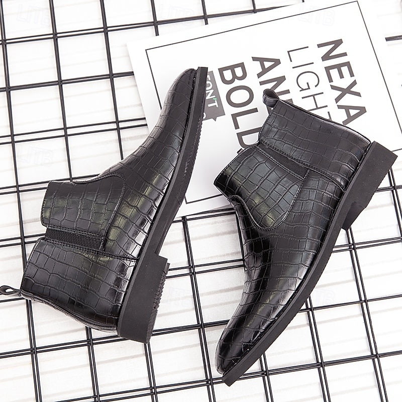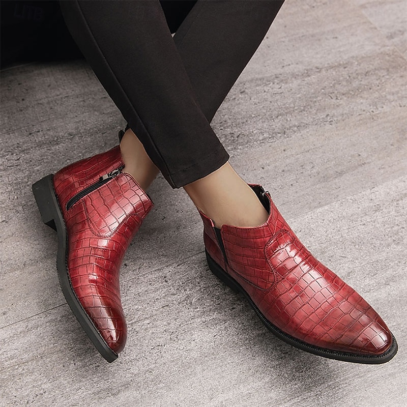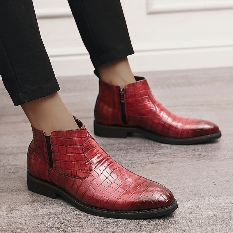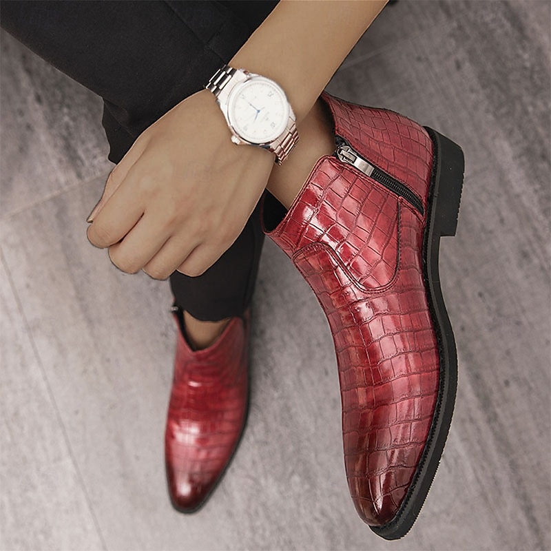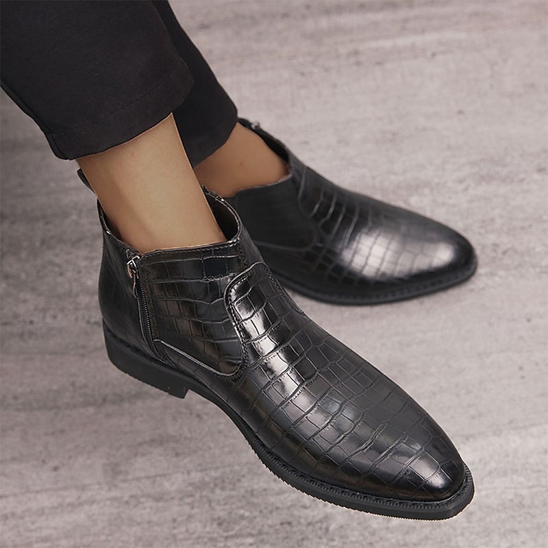 Highlights [Material] : Crafted from premium PU leather, these ankle boots boast a refined crocodile pattern that adds an exotic flair to the classic Chelsea boot style. The burgundy and black color options are versatile choices for elevating both formal and casual ensembles. [Fit] : Designed with a sleek and pointed toe, these boots offer a new-age twist on a timeless silhouette. The ankle-high design gives a contemporary edge while providing enough coverage and support for all-day comfort. [Design Highlights] : The standout feature of these Chelsea boots is the combination of elegant stitching and practical elastic side panels, allowing for effortless slip-on functionality while maintaining a snug fit. The zipper closure further enhances the ease of wear and adds to the sophisticated look. [Occasions] : Perfect for Christmas gatherings, formal events, and parties, these boots transition seamlessly from daytime meetings to evening celebrations. Their fashionable design makes them an ideal choice for any event where you want to leave a lasting impression. [Size Range] : Available in a variety of sizes to ensure a perfect fit, ranging from US6-6.5 to US11. These boots are designed to cater to a wide range of foot sizes, ensuring comfort and style for every occasion.