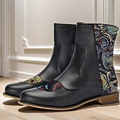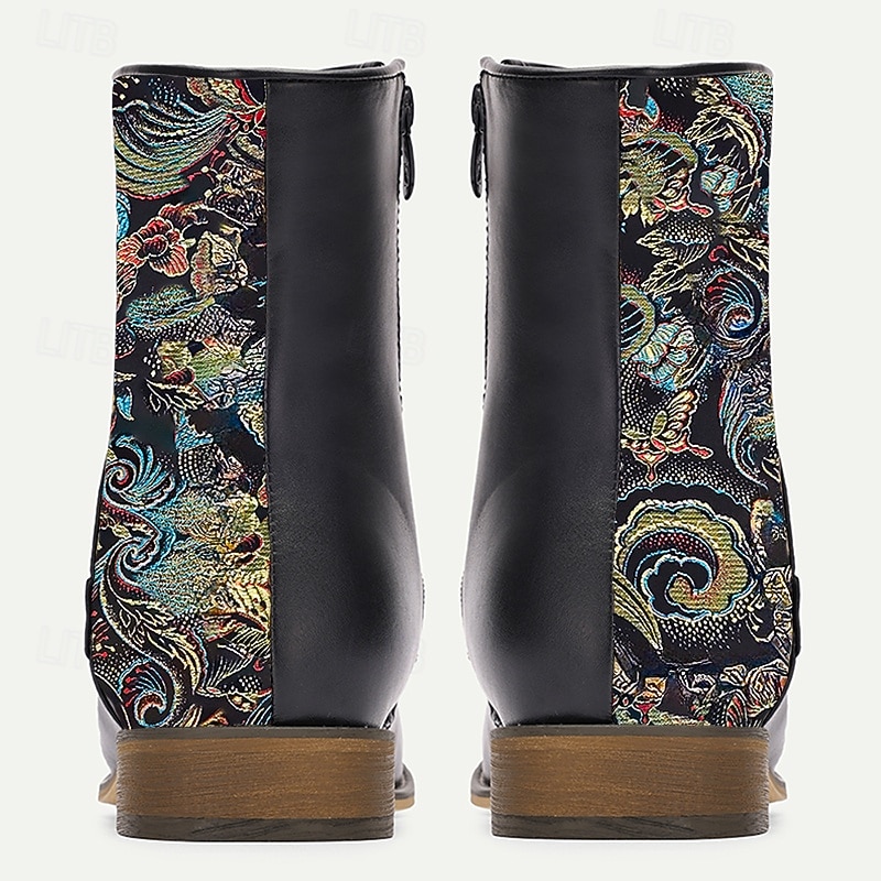 Highlights [Fabric] : Expertly crafted from high-quality PU leather and jacquard fabric, these men's boots offer a perfect blend of sophistication and durability. The luxurious material combination ensures comfort and a sleek appearance, while the intricate jacquard patterns add a distinctive touch. [Silhouette] : Designed with a new-age ankle boot style, these boots reach mid-calf height, providing versatility to suit both formal and casual outfits across different seasons. The round toe design and clean lines contribute to their timeless silhouette. [Design Highlights] : These elegant boots feature a special embroidered jacquard pattern on the side panels, showcasing a vibrant, artistic flair. The lace-up closure enhances the classic look and offers an adjustable fit, while the rubber outsole provides excellent slip resistance. [Occasions] : Ideal for both formal and casual wear, these boots are perfect for making a statement with a hint of artistic expression. Whether you're attending a semi-formal event or seeking a refined addition to your everyday wardrobe, these boots deliver style and versatility. [Size Range] : Available in a wide range of sizes from US6 / EU39 / UK5 to US15 / EU48 / UK14, these boots cater to various foot sizes, ensuring a comfortable fit for men looking to complement their attire with elegance and flair.