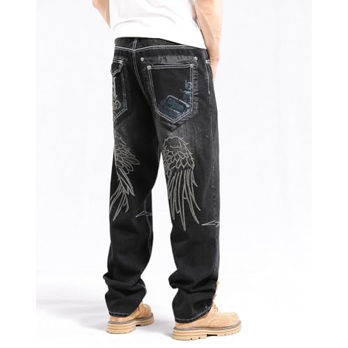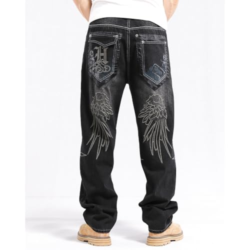 Fabric type: 80% Cotton, 20% PolyesterCare instructions: Machine WashOrigin: ImportedClosure type: ZipperSize: 30-46.Please refer to the size chart before ordering. Machine WashPremium Material: 80% cotton blend fabric for breathability and durability, relaxed fit design with straight-leg silhouetteWide Leg Skater Design: These denim pants are designed with a wide leg skater style, offering a snug and fashionable fit with a straight and relaxed silhouetteFeature: The back of the jeans has embroidered wing patterns and the pockets are designed with embroidered letter, wide leg, 2 side pockets and 2 back pockets, skateboard pants, hip hop jeans,punk jeansOccasions: These black wide leg pants are not only fashionable denim jeans, but they also serve as versatile streetwear, suitable for skateboarding, dancing, jogging, and casual everyday wear Perfect for everyday use. superior materials and excellent craftsmanship ensure long-lasting durability.