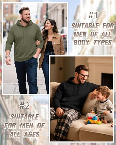 Fabric type: 75% Polyester, 20% Cotton, 5% SpandexCare instructions: Machine WashClosure type: Pull OnNeck style: Crew NeckBreathable Flexible Fabric: men's long sleeve hoodies in 75% polyester, 20% cotton, and 5% spandex offer a lightweight, stretchy, and breathable fit; Ideal for casual wear or light activities, these hoodies provide comfort, freedom of movement, and quick drying performance for whole-day easeDrawstring and Pocket Design: same-color drawstrings ensure a neat look, blending into men's big and tall hoodies; They let you adjust the hood easily; The front pocket stores small items like keys/cards, merging practicality with style for daily useRaglan Sleeves Design: hoodie t-shirts for men with raglan sleeves create a wider range of motion, suitable for active days or relaxed lounging; The seamless arm-to-shoulder transition also adds a current, sporty silhouette that elevates casual looksCasual Active Hoodie: versatile men's athletic hoodies available in regular and plus sizes; Lightweight, it pairs with sweatpants or shorts for standalone wear in spring, fall, or cool summer days; In winter, it layers smoothly under baseball jackets, denim coats, etc. Ideal for casual wear and light workouts—comfortable, functional, and season-friendly3-pack Solid Hoodies: a 3-pack of solid pullover hoodie for men in varied colors; Each color suits distinct occasions: one for sports like running or workouts, another for casual outings or work, and the third for outdoor activities—hiking, camping, traveling, 4 seasons included Perfect for everyday use. finest materials and excellent craftsmanship ensure long-lasting durability.