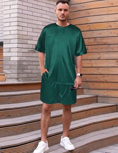 • 【Silky Pyjama Set】- The relaxed fit two-piece men satin pjs set features the half button-down U neck short sleeve top with a chest pocket, and matches casuals silk short with elastic waist and side pockets. Men's satin pajama set uses the ergonomic H-shaped loose design, give you the ultimate comfort.