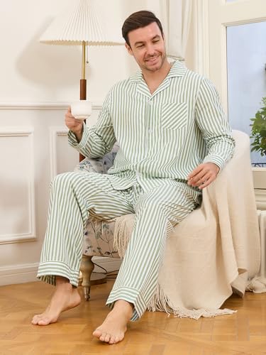 U2SKIIN Men's Pajama Set, smooth Cotton Button-Down Striped Pajamas for Men, Long Sleeve Sleepwear with Pockets & Front Fly (Green White, L)